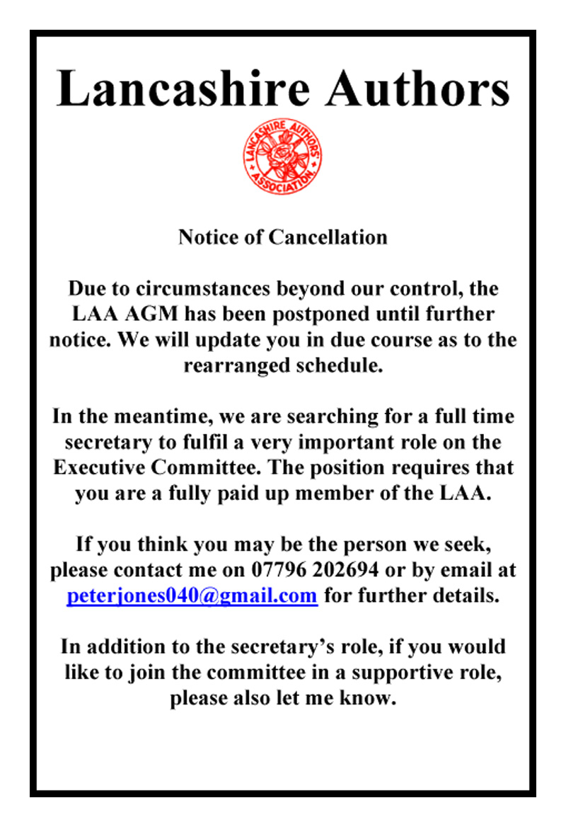LANCASHIRE AUTHORS' ASSOCIATION UPCOMING AGM POSTPONED Detaails below