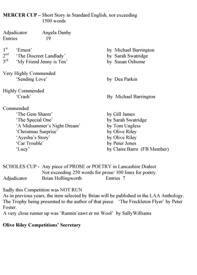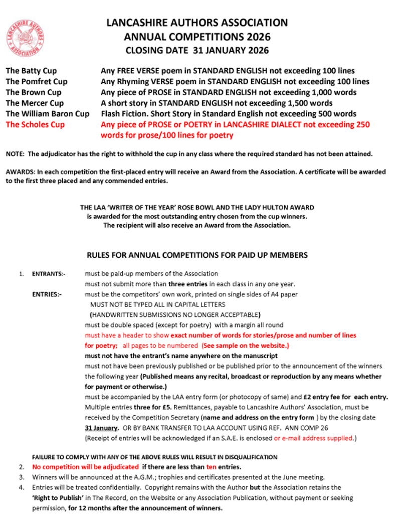 We are an association devoted to the study of Lancashire literature, history, traditions and dialect. Podcasts | Children's Page | Other Competitions | Contact Us | Links LAA Competitions The Annual Competitions are open to members only Click here for downloadable form